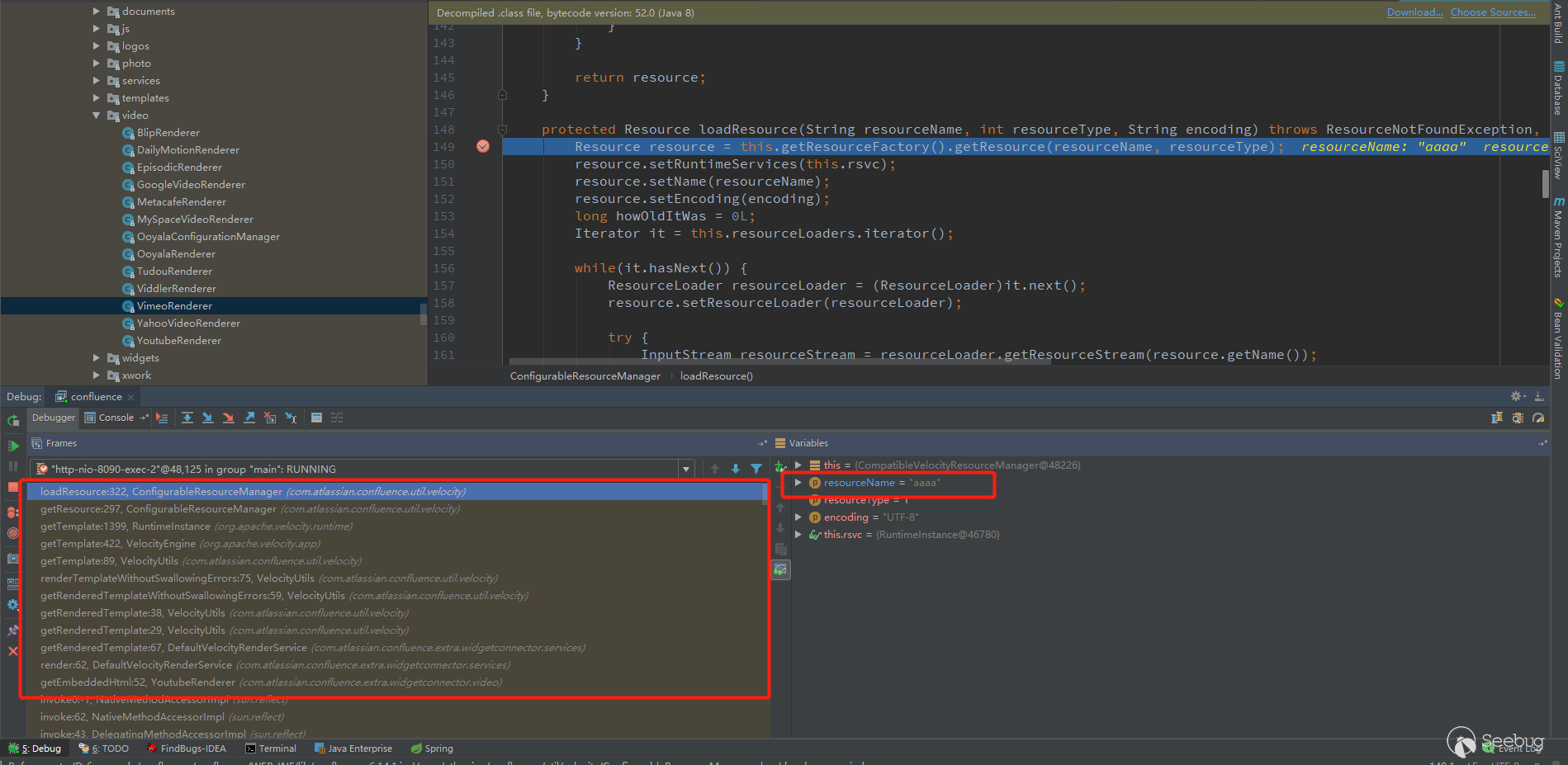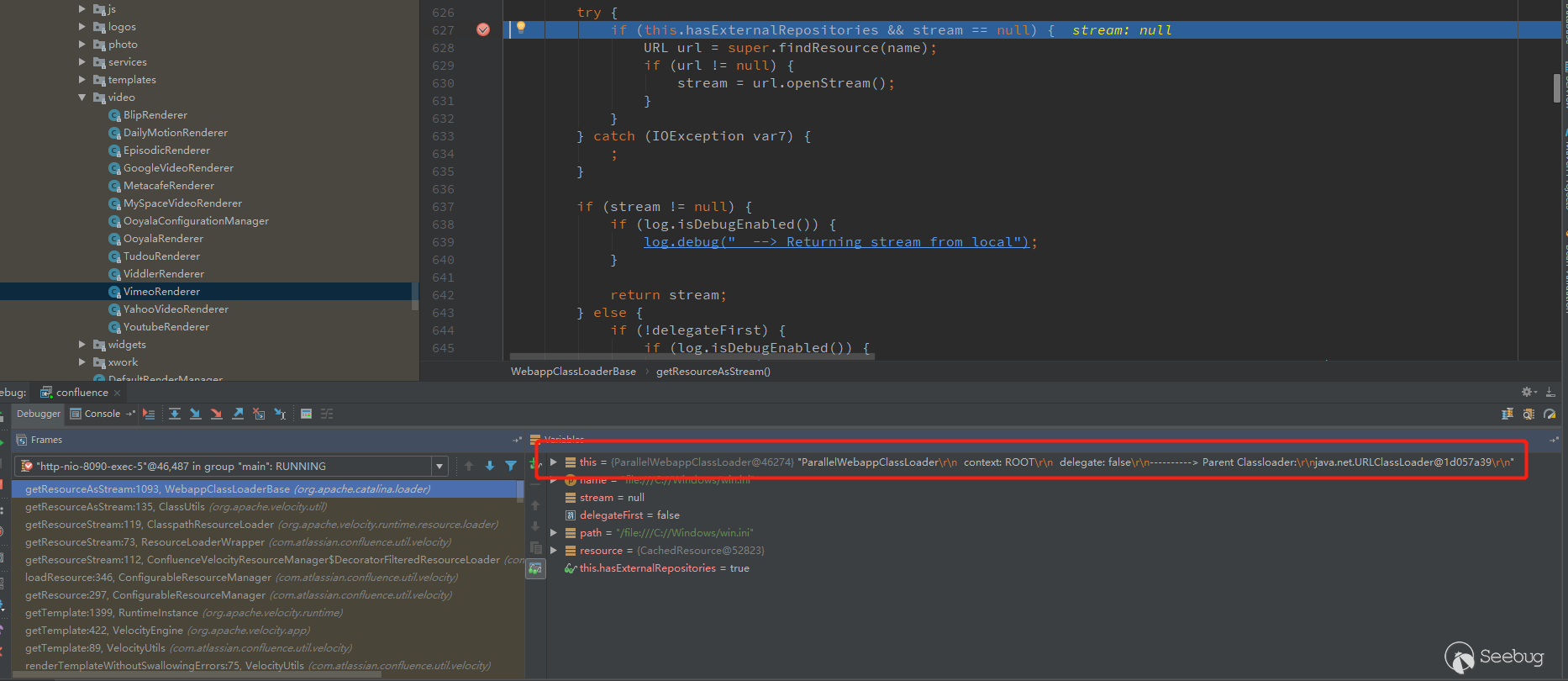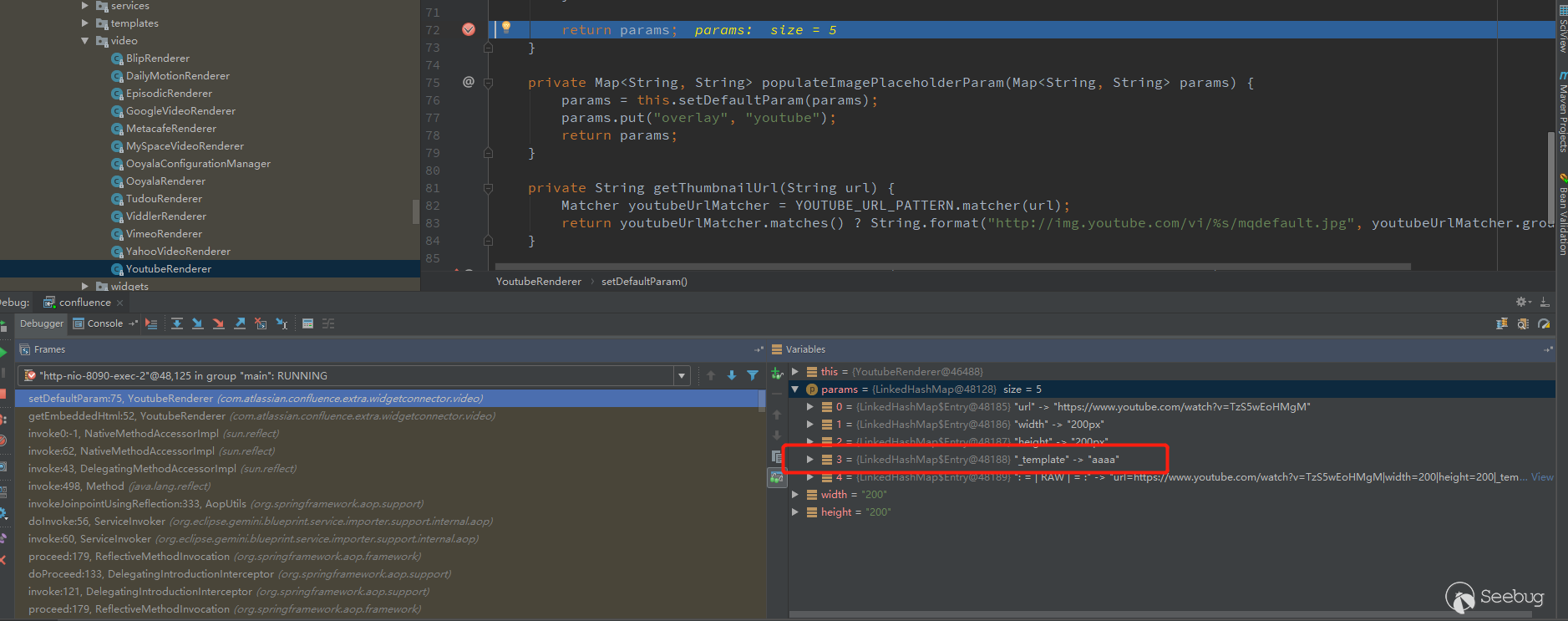 开始debug模式,因为测试插入的是Youtube视频,所以调用的是com/atlassian/confluence/extra/widgetconnector/video/YoutubeRenderer.class