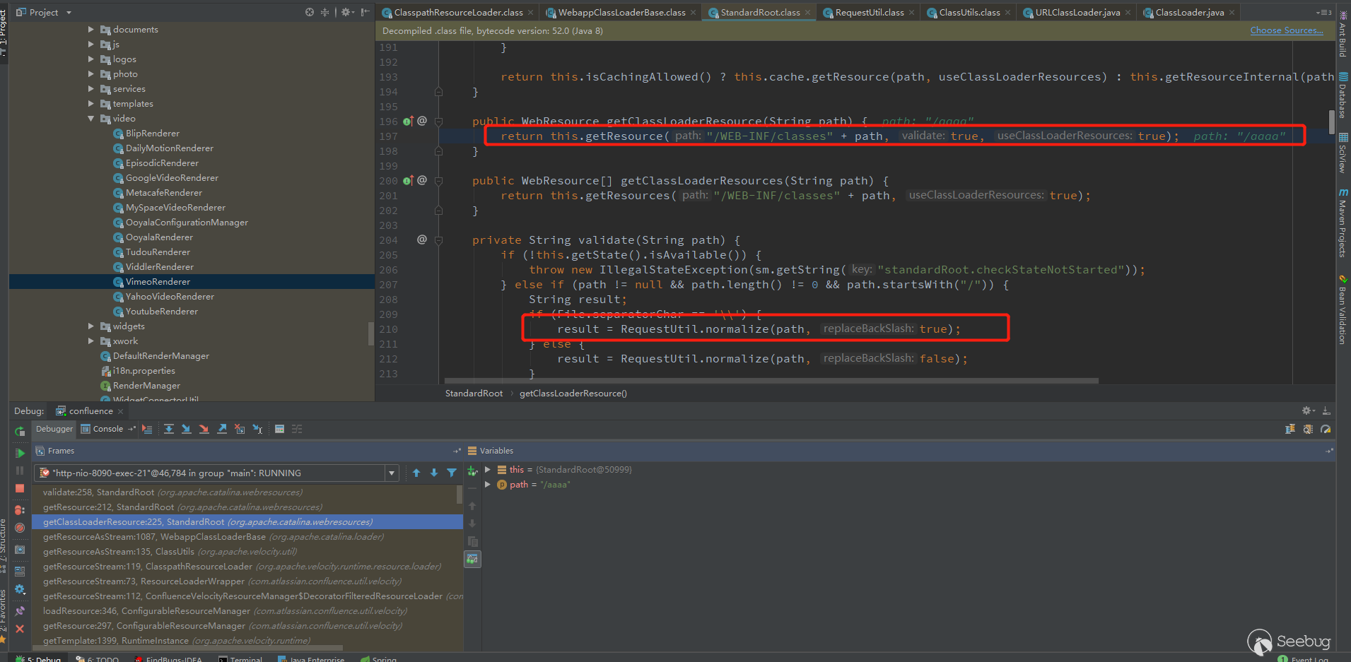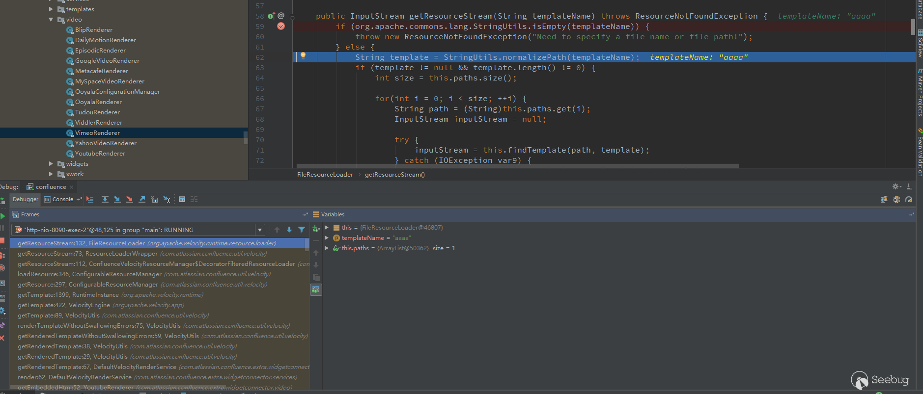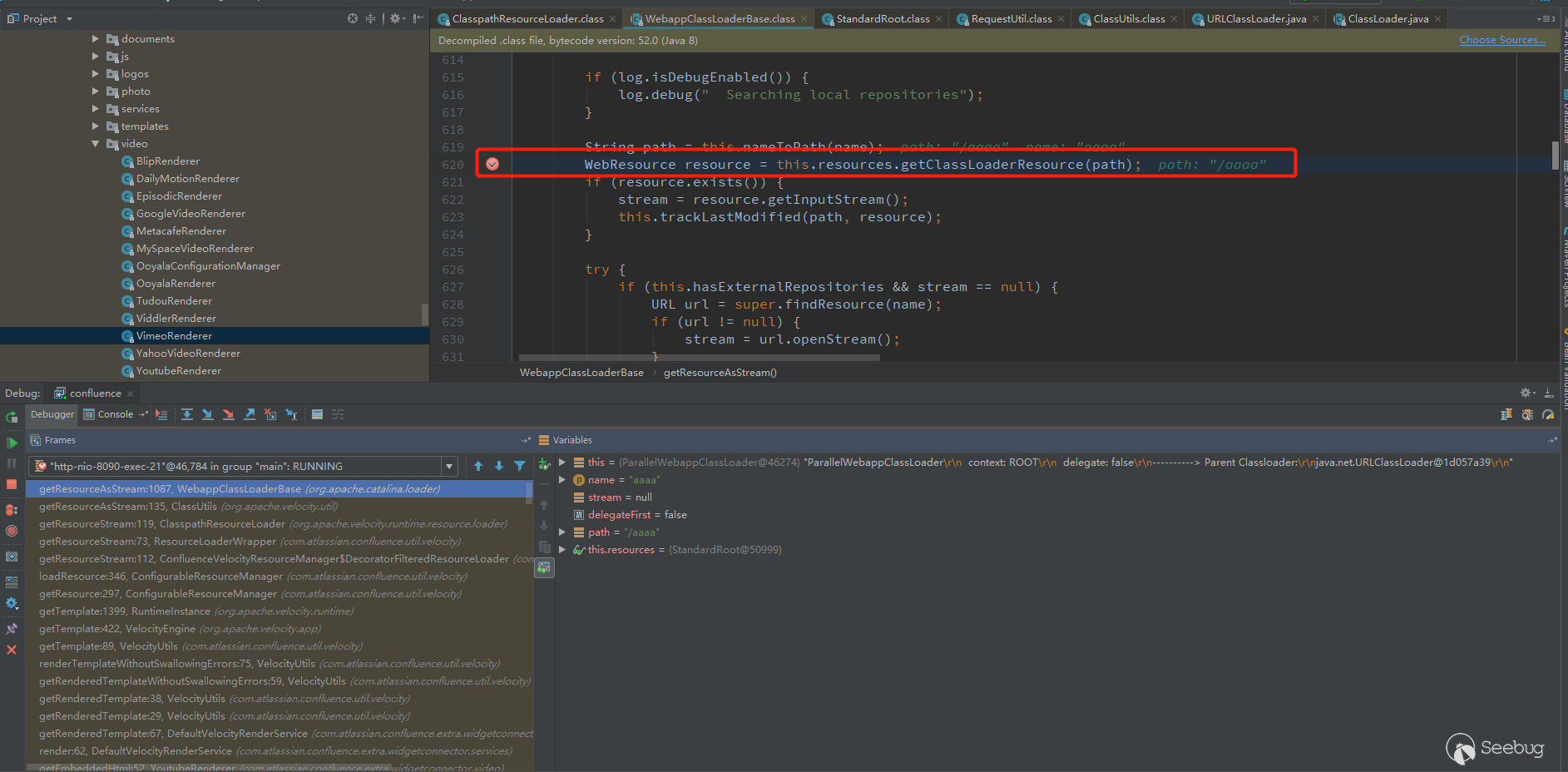 开始debug模式,因为测试插入的是Youtube视频,所以调用的是com/atlassian/confluence/extra/widgetconnector/video/YoutubeRenderer.class