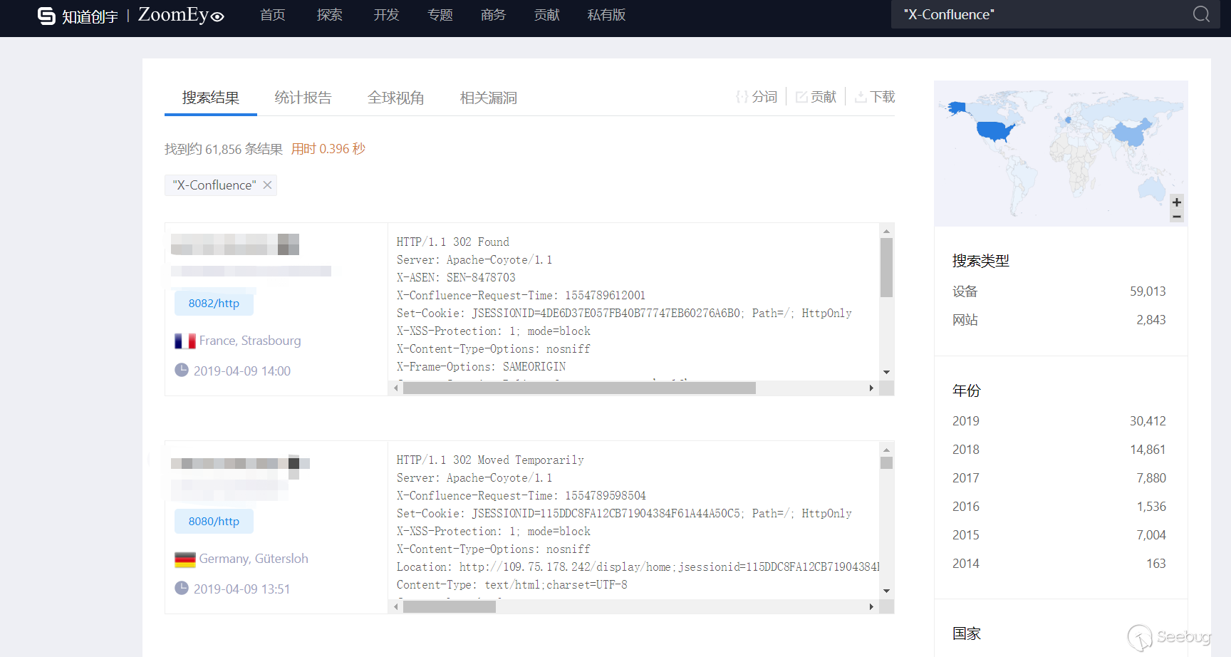 根据 ZoomEye 网络空间搜索引擎对关键字 “X-Confluence” 进行搜索,共得到 61,856 条结果,主要分布美国、德国、中国等国家。