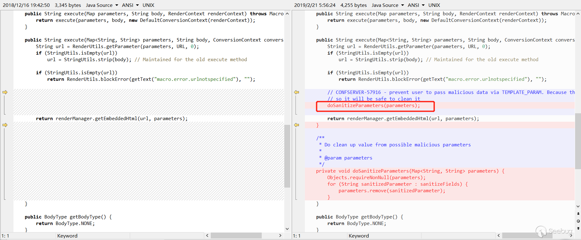确认漏洞点是Widget Connector,下载最新版的比对补丁,发现在com\atlassian\confluence\extra\widgetconnector\WidgetMacro.java里面多了一个过滤,这个应该就是这个漏洞最关键的地方。