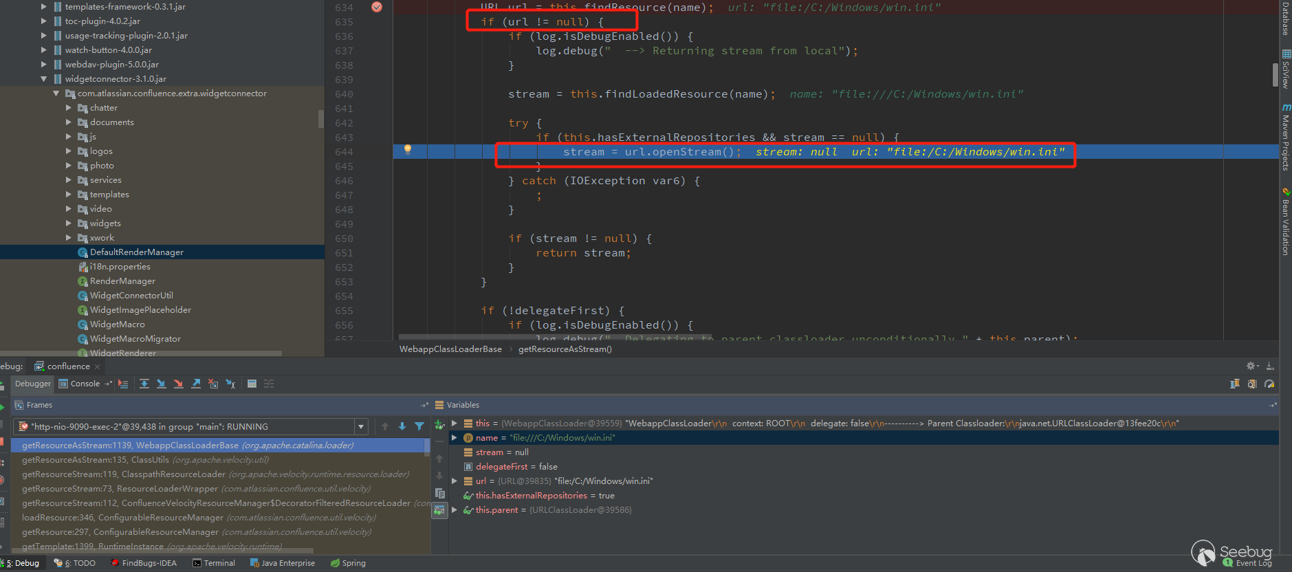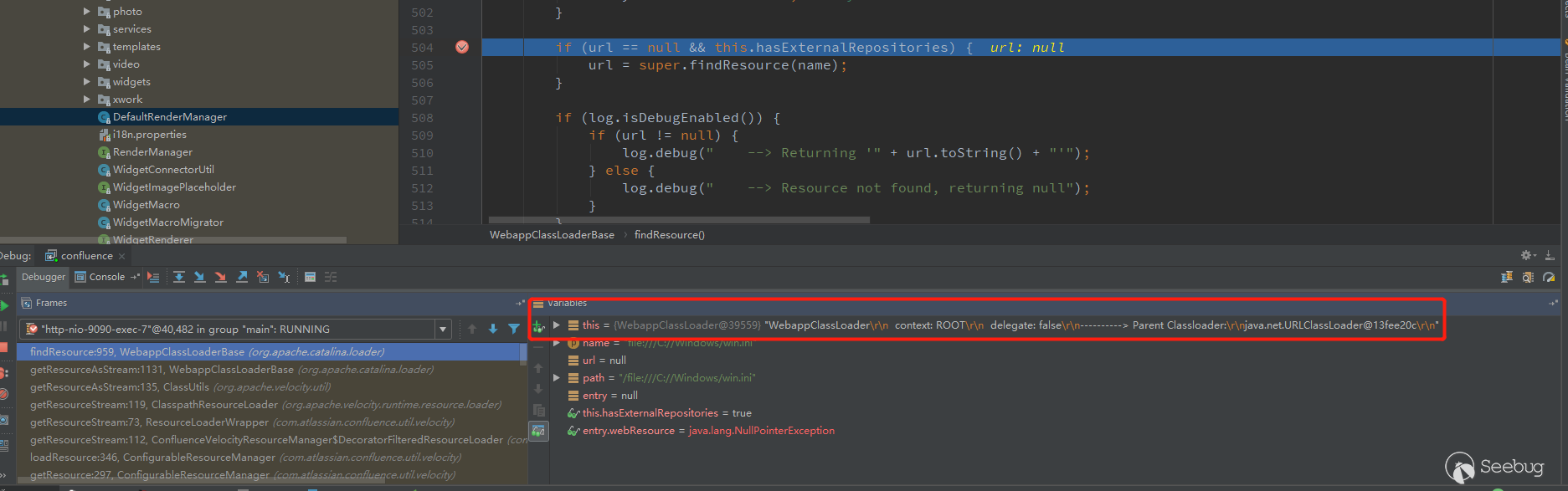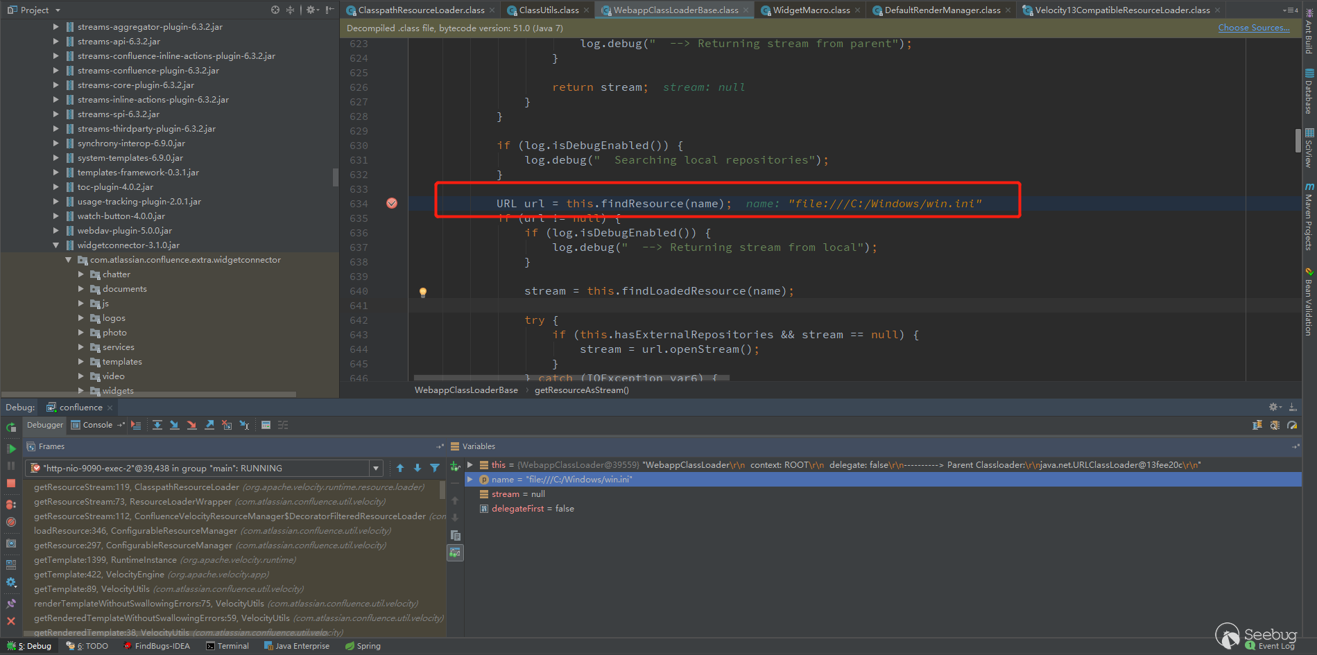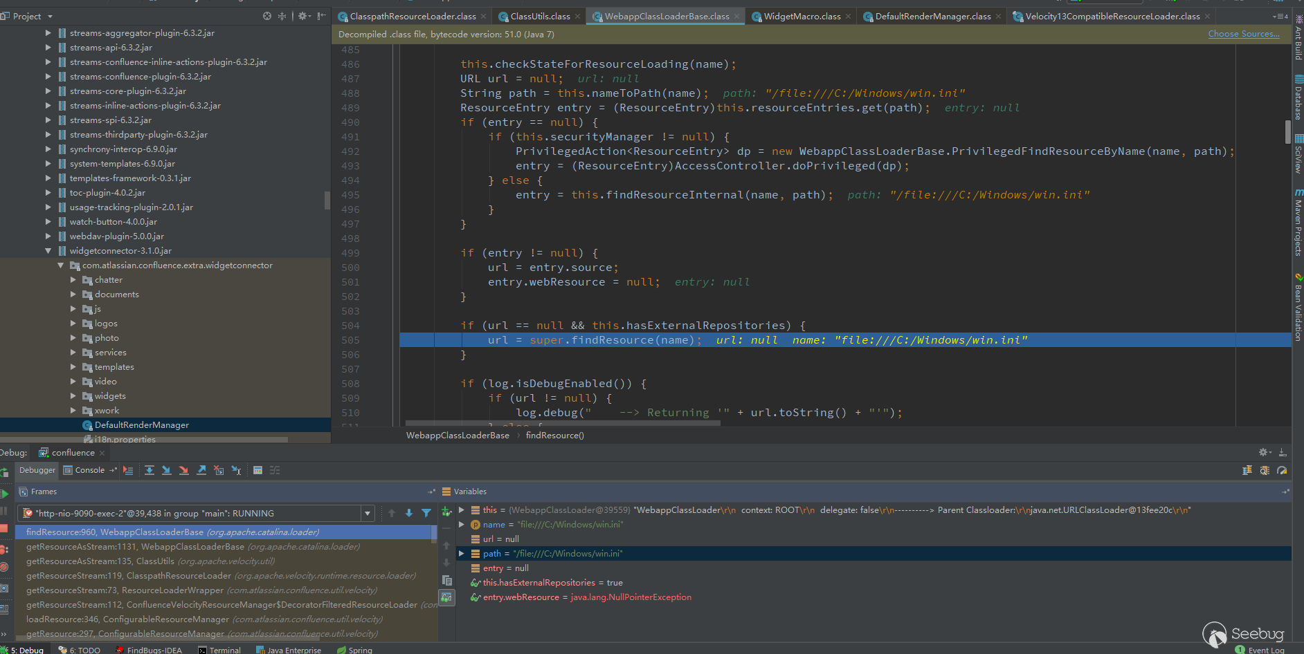 问题还是在ClasspathResourceLoader上面,步骤和之前的是一样的,断到/org/apache/catalina/loader/WebappClassLoaderBase.class的getResourceAsStream方法