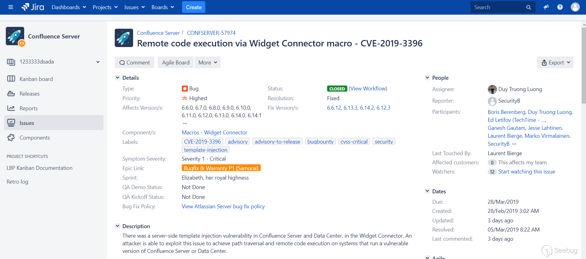 看到官方发布了预警,于是开始了漏洞应急。漏洞描述中指出Confluence Server与Confluence Data Center中的Widget Connector存在服务端模板注入漏洞,攻击者能利用此漏洞能够实现目录穿越与远程代码执行。